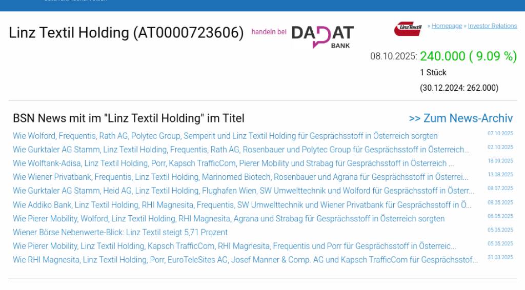 Linz Textil Holding am 8.10. 9,09%, Volumen 4% normaler Tage