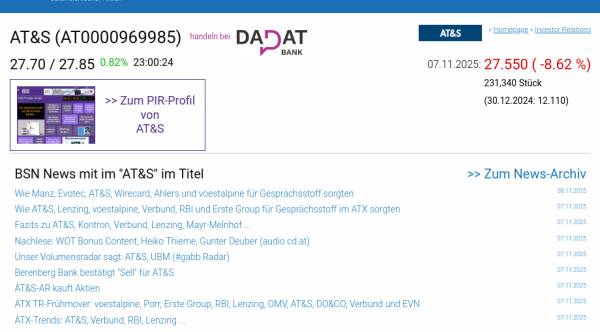 AT&S am 7.11. -8,62%, Volumen 176% normaler Tage