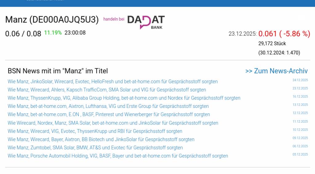 Manz am 23.12. -5,86%, Volumen 258% normaler Tage