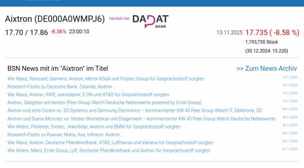 Aixtron am 13.11. -8,58%, Volumen 143% normaler Tage
