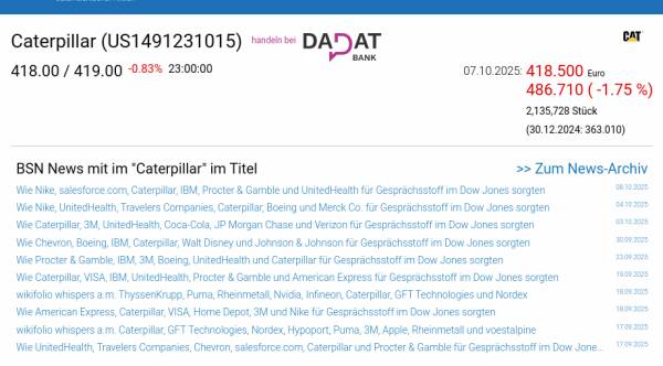 Caterpillar am 7.10. -1,75%, Volumen 77% normaler Tage