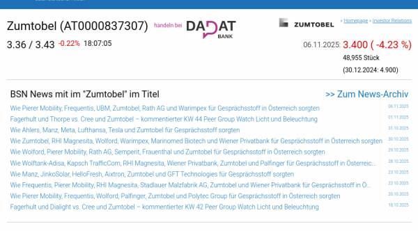 Zumtobel am 6.11. -4,23%, Volumen 244% normaler Tage
