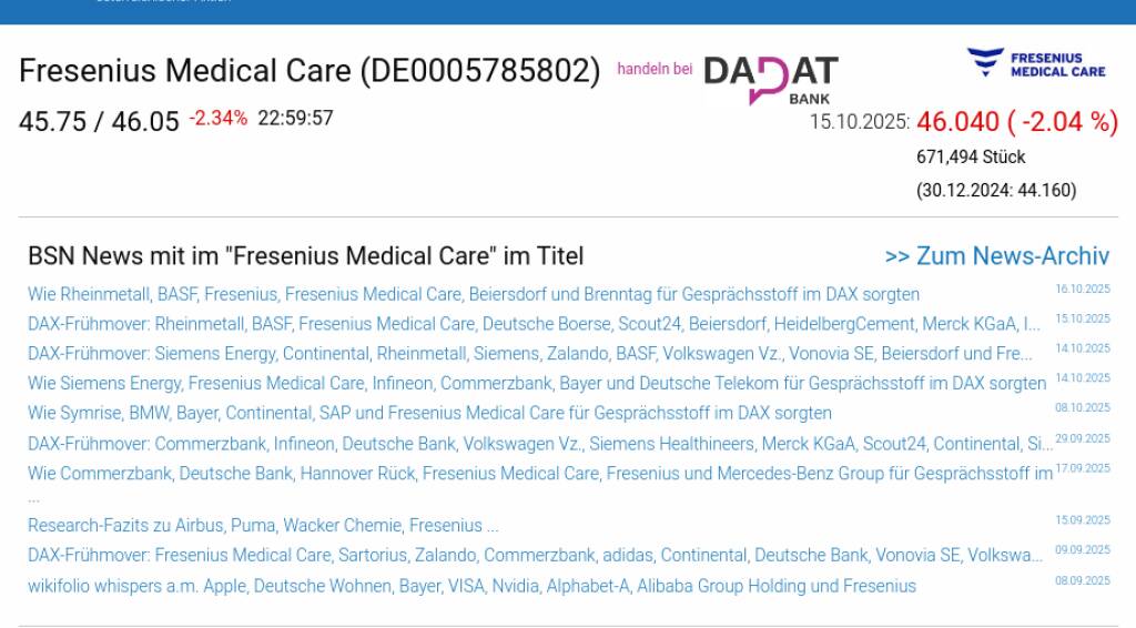 Fresenius Medical Care am 15.10. -2,04%, Volumen 124% normaler Tage