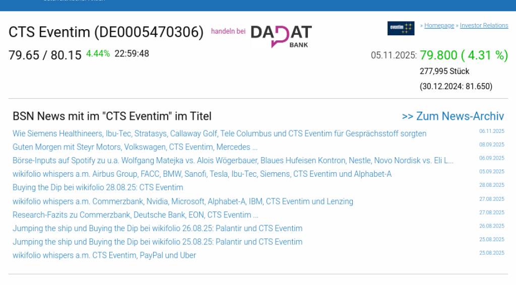 CTS Eventim am 5.11. 4,31%, Volumen 174% normaler Tage