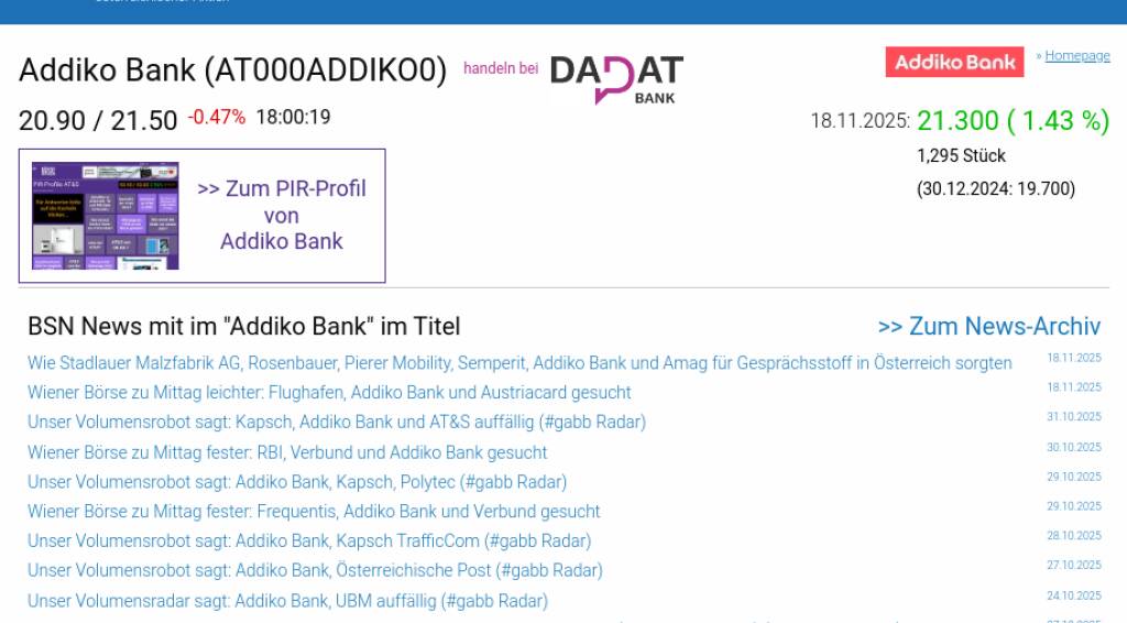 Addiko Bank am 18.11. 1,43%, Volumen 56% normaler Tage