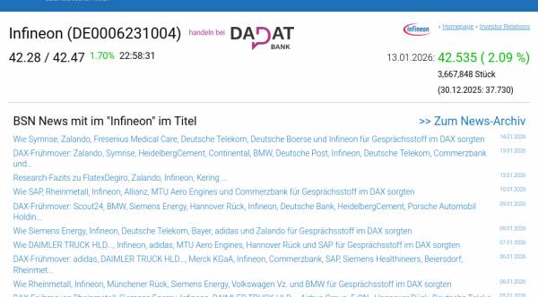 Infineon am 13.1. 2,09%, Volumen 85% normaler Tage