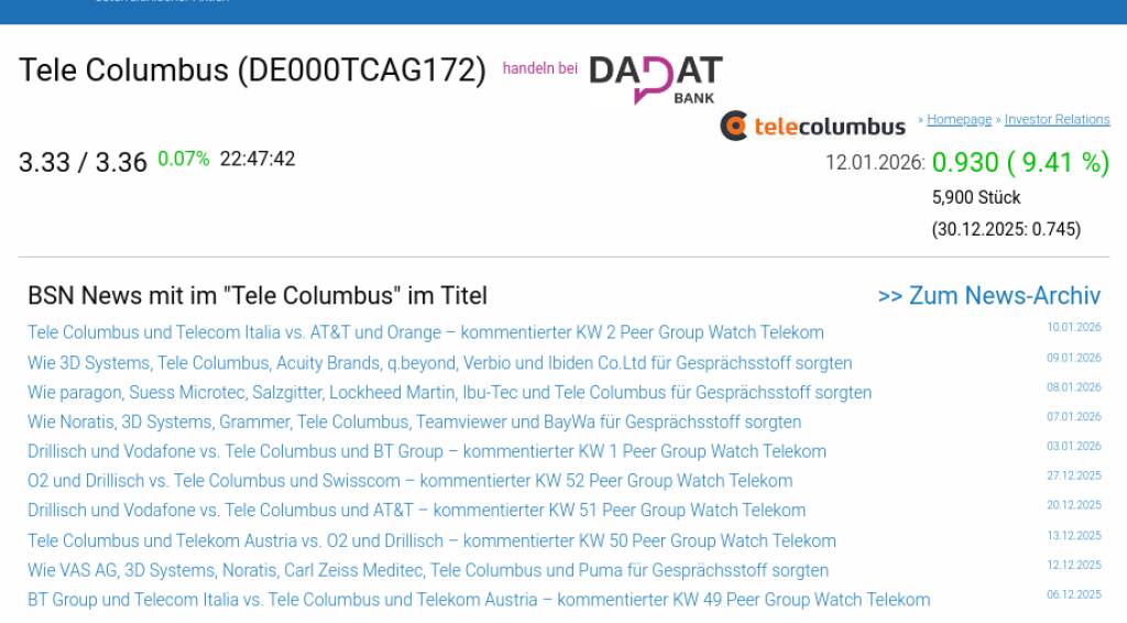 Tele Columbus am 12.1. 9,41%, Volumen 27% normaler Tage