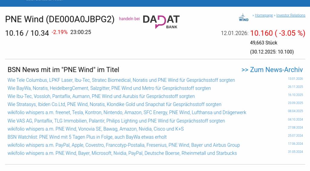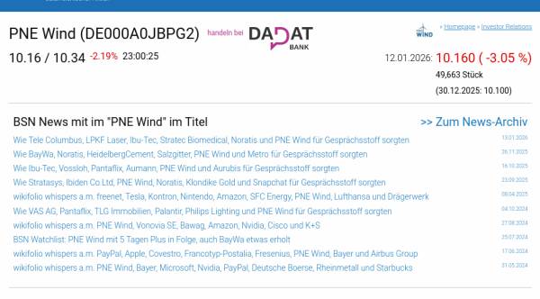 PNE Wind am 12.1. -3,05%, Volumen 138% normaler Tage