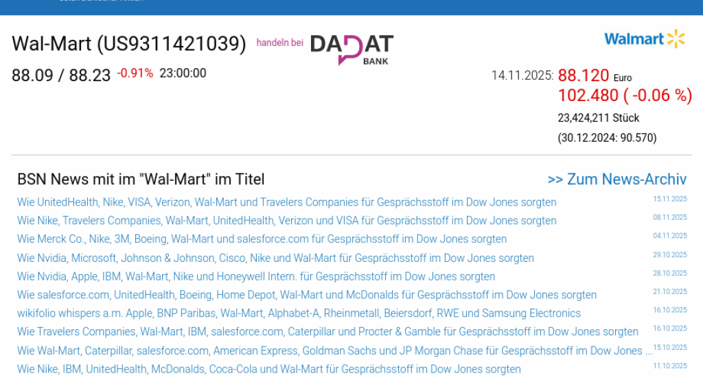 Wal-Mart am 14.11. -0,06%, Volumen 128% normaler Tage