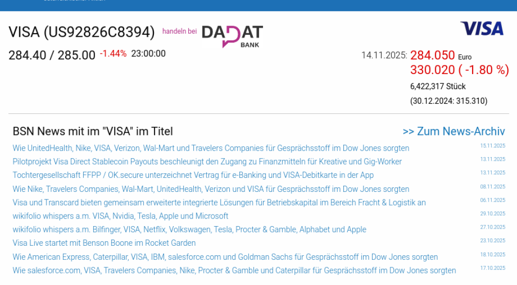 VISA am 14.11. -1,80%, Volumen 100% normaler Tage