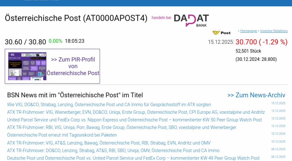 Österreichische Post am 15.12. -1,29%, Volumen 143% normaler Tage