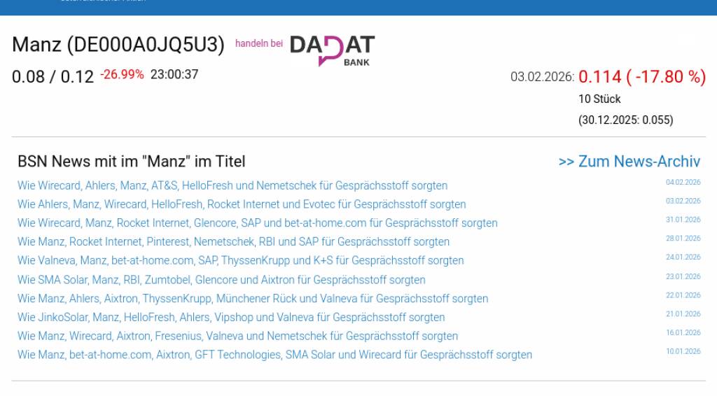 Manz am 3.2. -17,80%, Volumen 0% normaler Tage