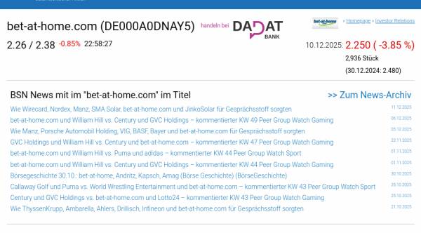 | bet-at-home.com | BAH | 2.25 | -3.85% |