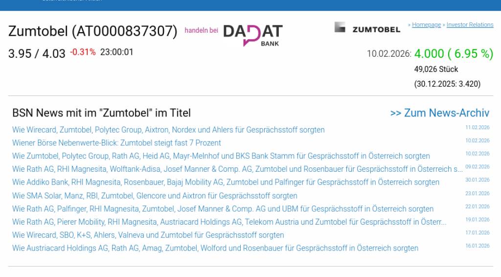 Zumtobel am 10.2. 6,95%, Volumen 187% normaler Tage
