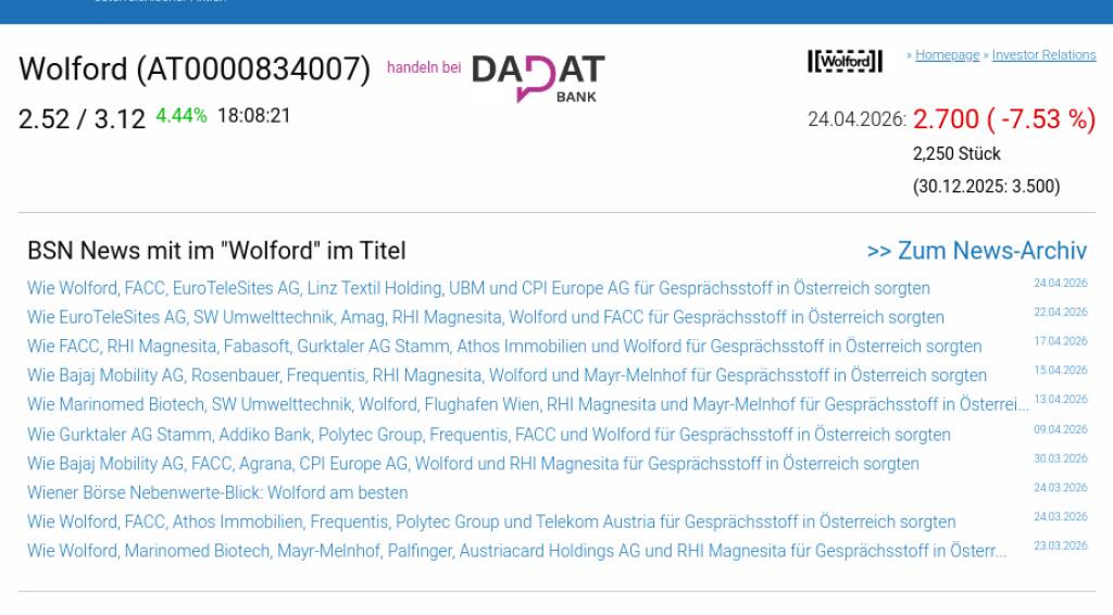 Wolford am 24.4. -7,53%, Volumen 265% normaler Tage