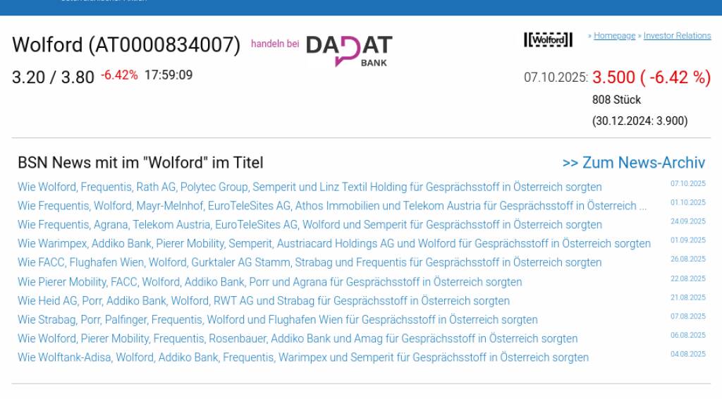 Wolford am 7.10. -6,42%, Volumen 105% normaler Tage