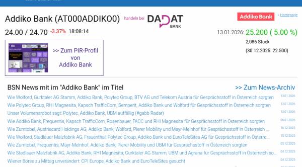 Addiko Bank am 13.1. 5,00%, Volumen 151% normaler Tage
