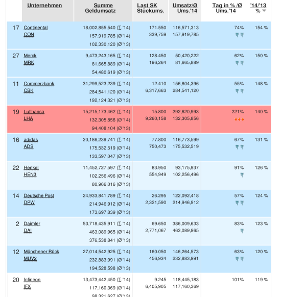Continental, Merck, Commerzbank, Lufthansa, adidas, Henkel, Deutsche Post, Daimler, Münchener Rück und Infineon sind jene Aktien, die 2014 so far auf deutlich höhere Durchschnittsumsätze als 2013 kommen. Spitzenreiter Continental weist hier einen Wert von 154 Prozent auf, im Schnitt wird täglich also das 1,54fache aus 2013 gehandelt. Bei Klick auf die Tabelle sieht man, wer vs. 2013 verloren hat.