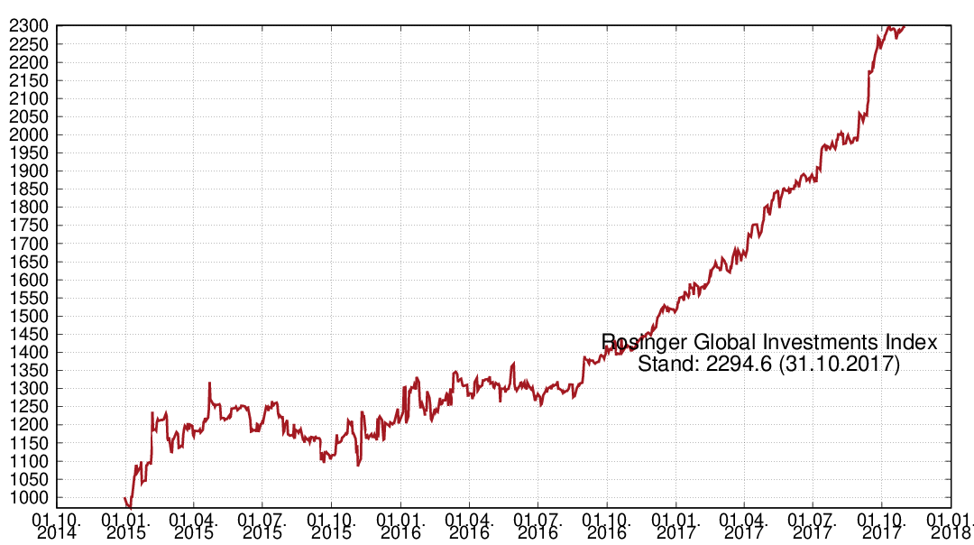 Im monatlichen Kursverlauf des Oktober 2017 ist besonders hervorzuheben, dass der „Rosinger Global Investments Index“ am 11. Oktober 2017 mit 2301,7 Punkten erstmals die 2300 Punkte Marke überschritten hat, was bedeutet, dass im betrachteten Zeitraum seit 1. Januar 2015 die Gesamtperformance an diesem Stichtag 11. Oktober 2017 erstmals bei mehr als 130% lag.
