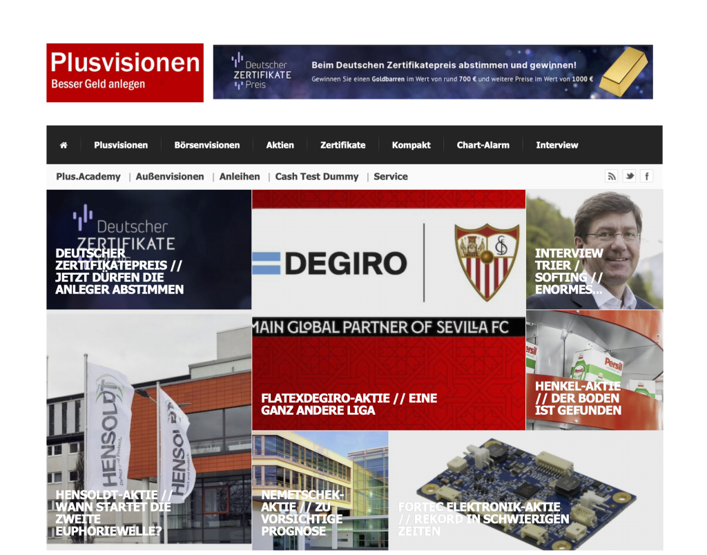 Plusvisionen ist ein Meinungs- und Analyse-Magazin für Wirtschaft, Börse und Geldanlage [vulgo: Sparen].Plusvisionen ist für Leser, die wissen wollen, was in der Wirtschaft läuft, weil Wirtschaft uns alle etwas angeht. Plusvisionen will beim Verstehen und Einordnen helfen und dabei auch unterhalten.