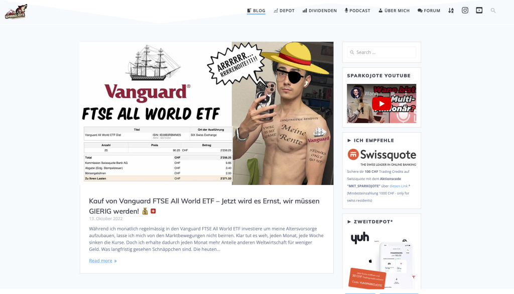Seit Anfang 2020 schreibe ich auf meinem Schweizer Finanzblog über meinen Weg vom Sparkontobesitzer zum Privatanleger. Ich vermittelt Grundlagen des Investierens und nehme Neuerungen von Smartphone-Banken, Robo-Advisors, Brokern und Säule 3a-Anbietern unter die Lupe.