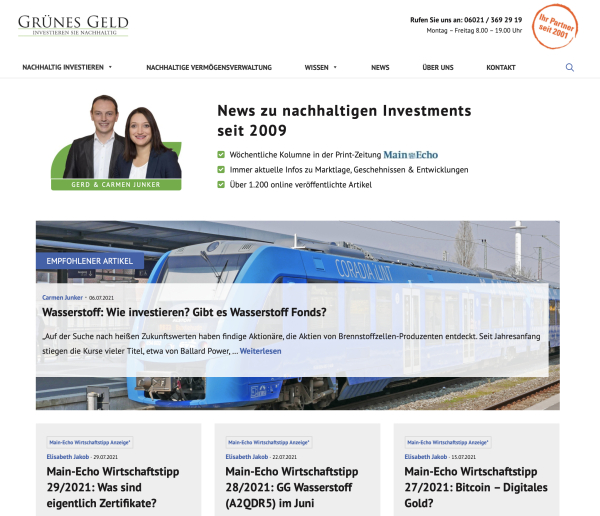 Seit nun fast 20 Jahren setzen wir uns dafür ein, dass Ihre private Geldanlage nachhaltig, ökologisch und sozial korrekt aufgestellt ist. Wir haben ein offenes Ohr für Sie und freuen uns, Ihre Wünsche umzusetzen. Dass Sie bei uns stets das gute Gefühl haben, im Mittelpunkt unseres Interesses zu stehen, ist kein Zufall: Wir haben Freude daran Ihre Finanzen jeden Tag ein Stückchen grüner werden zu lassen.