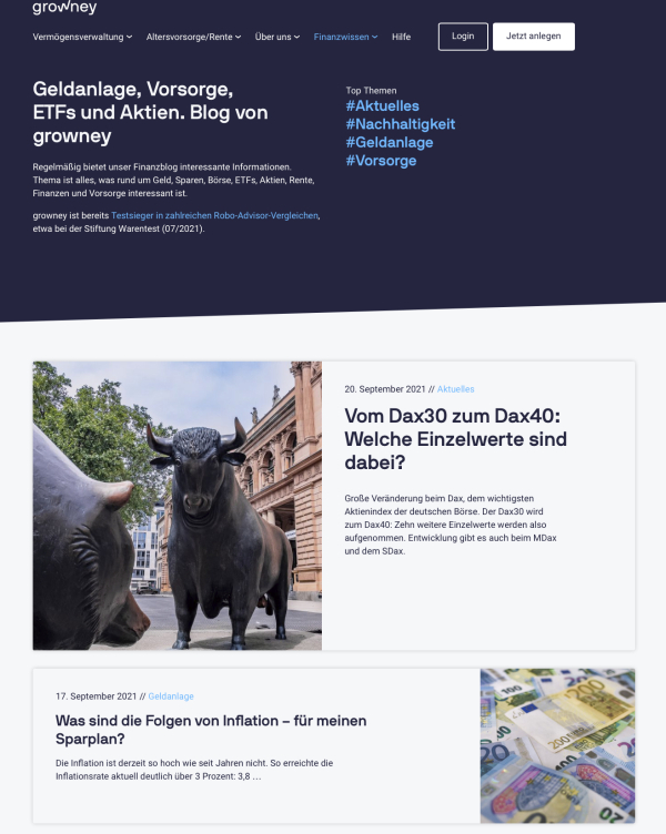 growney ist einer der größten digitalen Vermögensverwalter im deutschsprachigen Raum. Das 2014 gegründete FinTech-Unternehmen verwaltet Geld für Privatkunden, Firmen und Versicherungen. Für eine bestmögliche Rendite investiert growney als sogenannter Robo-Advisor weltweit. Die Gründer von growney blicken auf über 25 Jahre Erfahrung mit Geldanlagen zurück. Sie verbinden diese praktische Kompetenz mit den Erkenntnissen aus der Wissenschaft zu einem ausgezeichneten Anlagekonzept. Für Strategie, Performance und Service ist growney bereits mehrfach prämiert worden - als einziger von 25 Robo-Advisorn wurde growney von Stiftung Warentest mit "Sehr gut" benotet (Finanztest 07/21, Geldanlage von € 100.000)