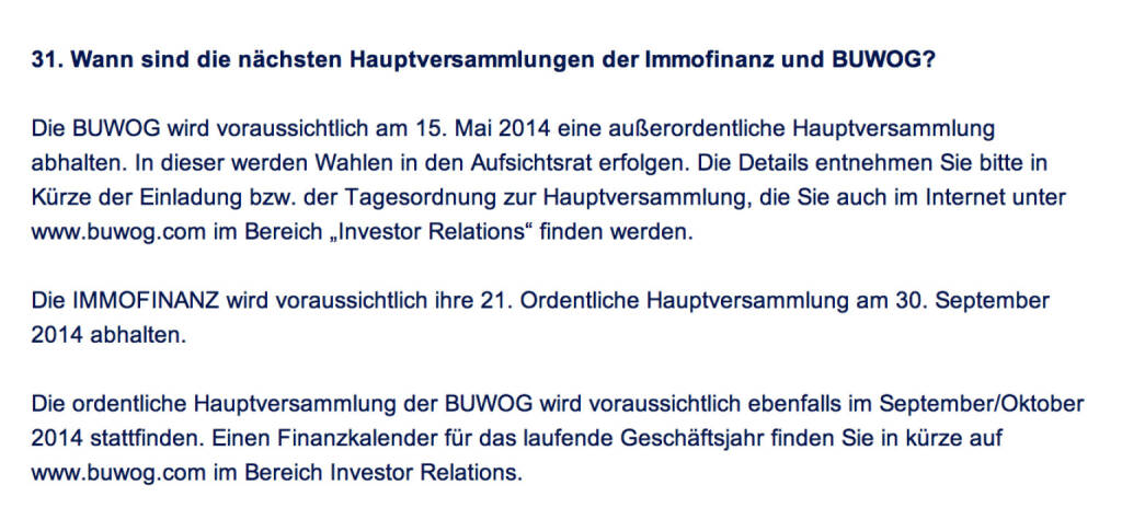 „ Frage an Immofinanz/ Buwog: Wann sind die nächsten Hauptversammlungen der Immofinanz und Buwog? “