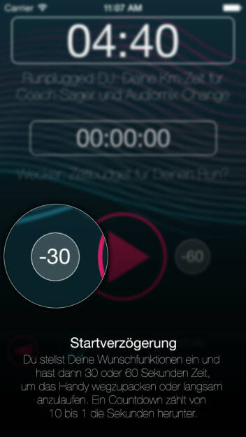 „ (APP) Runplugged Startverzögerung: Du stellst Deine Wunschfunktionen ein und hast dann 30 oder 60 Sekunden Zeit, um das Handy wegzupacken oder langsam anzulaufen. Ein Countdown zählt von 10 bis 1 die Sekunden herunter - Appdownload unter http://bit.ly/1lbuMA9 “