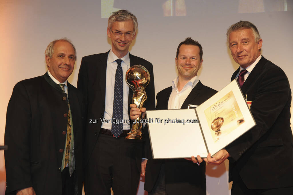 Energy Globe Austria Award 2013 geht an Wiener Firma Solar Fidelity : Energy Globe Gründer Wolfgang Neumann, Wirtschaftslandesrat OÖ Michael Strugl, Energy Globe Austria Award 2013 Sieger Solar Fidelity mit Pressesprecher Bernhard Lehner, Präsident des Österreichischen Gemeindebundes Helmut Mödlhammer (c) Energy Globe Foundation