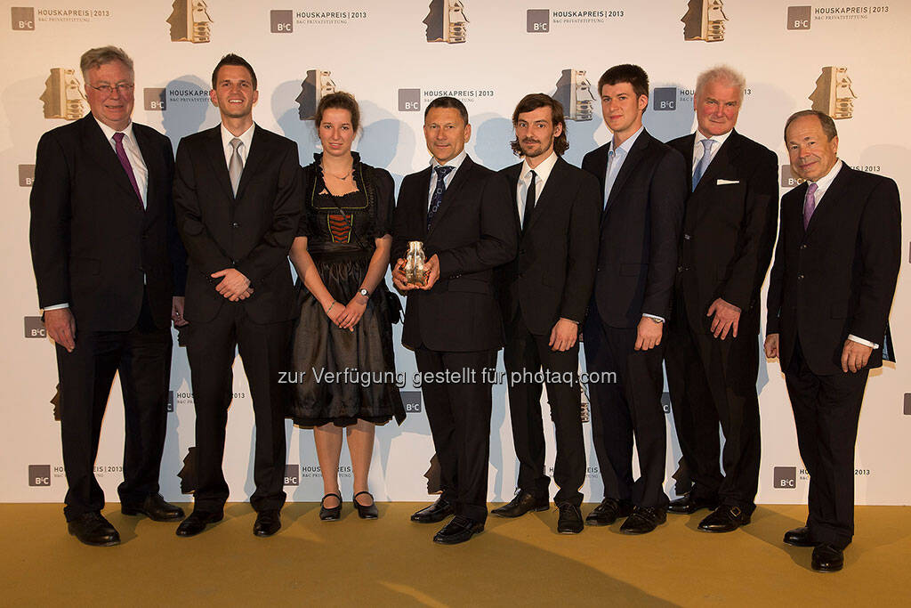 Universität Innsbruck gewinnt Houskapreis 2013 - Georg Bauthen, Stv. des Vorsitzenden B&C Privatstiftung; Lukas Märk, Ionicon Analytik, Achim Hansel (in der Mitte mit Preis) und sein Team, Institut für Ionenphysik und Angewandte Physik; Wolfgang Hofer, Vorstandsmitglied B&C Privatstiftung und Erich Hampel, Vorstandsvorsitzender B&C Privatstiftung (Foto: B&C Privatstiftung)