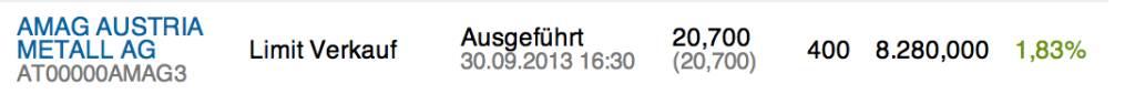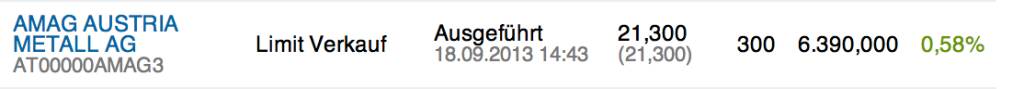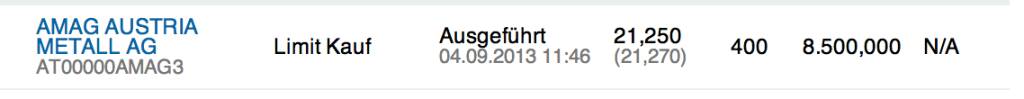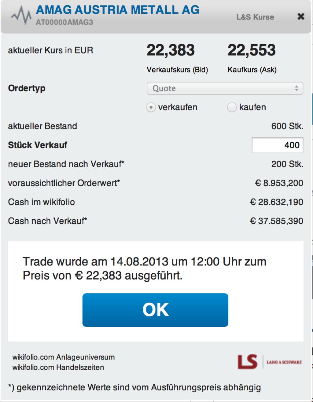 7. Trade für https://www.wikifolio.com/de/DRASTIL1-Stockpicking-sterreich: Verkauf 400 Amag zu 22,383: "14.08.2013 12:06:14 WFDRASTIL1 - Kommentar zu AMAG AUSTRIA METALL AG (AT00000AMAG3) - Ich habe für 400 der 600 Amag 6,42 Prozent Gewinn mitgenommen, die Spekulation ist weitgehend aufgegangen, kurzfristig sehe ich nicht mehr allzu viel Platz nach oben"