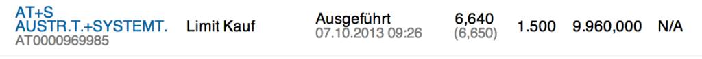 30. Trade für https://www.wikifolio.com/de/DRASTIL1: Kauf 1500 AT&S bei 6,64 - in der Zeichnung war es nicht möglich, daher jetzt zugeschlagen, die Erste Group mag die Leobener auch "We expect to see a solid result for 2Q14 (September) ahead, prompting positive estimate revisions and leading to a new target price of EUR 8.8 (previously EUR 8.6) and a Buy recommendation (previously Accumulate)."