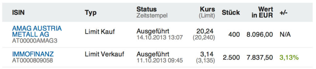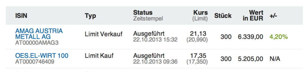 31. und 32. Trade für https://www.wikifolio.com/de/DRASTIL1: Teilverkauf 2500 Immofinanz bei 3,14 und Verstärkung der Amag-Position (von 300 auf 700) bei 20,24, de facto gleiche Investmentsumme