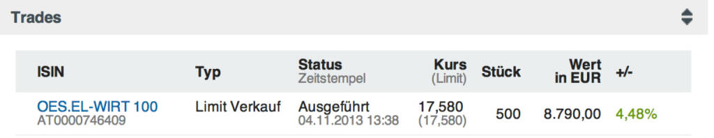 6. Trade für https://www.wikifolio.com/de/DRASTIL1-Stockpicking-sterreich : 31.07.2013 08:30:0 WFDRASTIL1Kommentar zu OES.EL-WIRT 100 (AT0000746409): "Habe 23 Prozent des Portfolios in Verbund gelegt; eine Aktie, die in den vergangenen Jahren niemand wollte, damit auch bereits recht gut nach unten abgesichert sein sollte, als low-beta-stock könnte es natürlich auch ein Problem mit der upside geben, aber gute Zahlen, siehe http://www.boerse-express.com/pages/1370866 , könnten schon etwas bewegen .."