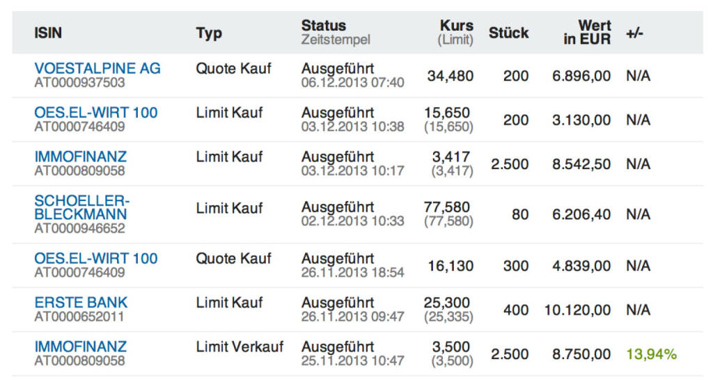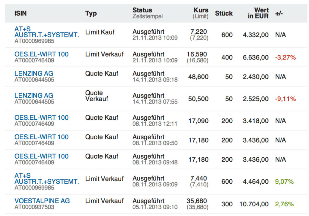 40 - 49. Trade für https://www.wikifolio.com/de/DRASTIL1 : "Da ich nun weitgehend mit Limits agiere, stelle ich auf kumulierte Orderzusammenfassung um, ausser es ist eine grössere Story dahinter. In den vergangenen zwei Wochen hat das wikifolio "nur" mit dem Markt performt, zwar konnte ich die Verkäufe von voestalpine und AT&S gut timen, die beiden grossen Positionen Lenzing (Gewinnwarnung) und Verbund (MSCI Austria-Herausnahme) waren in punkto Timing aber Fehlgriffe. Bei Lenzing habe ich die News gehandelt und ein wenig hinuntergemischt. Die Position bleibt jetzt long. Heute habe ich Verbund reduziert, weil am 26.11. MSCI-Termin ist, dafür bei AT&S wieder aufgestockt"