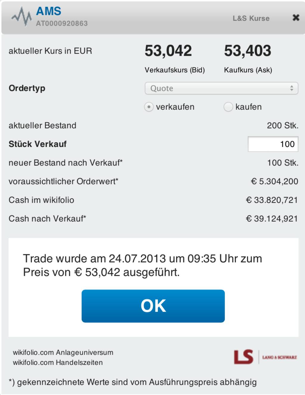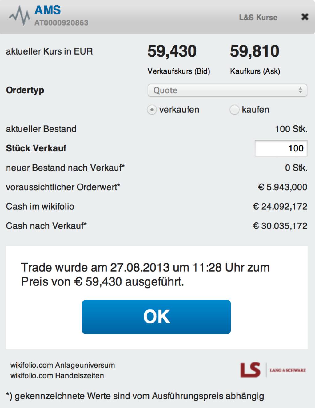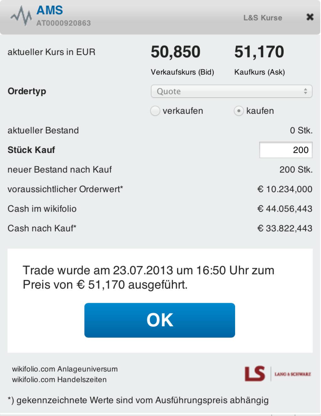 3. Trade für https://www.wikifolio.com/de/DRASTIL1-Stockpicking-sterreich : 200 ams zu 51,170 Euro - Kommentar zu AMS (AT0000920863) auf wikifolio am 23.07.2013 16:53:37: "ams ist ein Unternehmen mit hochspannenden Produkten, toller Historie, aber fürchterlicher Kommunikation. Dafür wird man nun abgestraft. Der Kauf bei 51,17 ist hochspekulativ, auch eine Wette auf bessere Kommunikation und mehr Visibilität"
