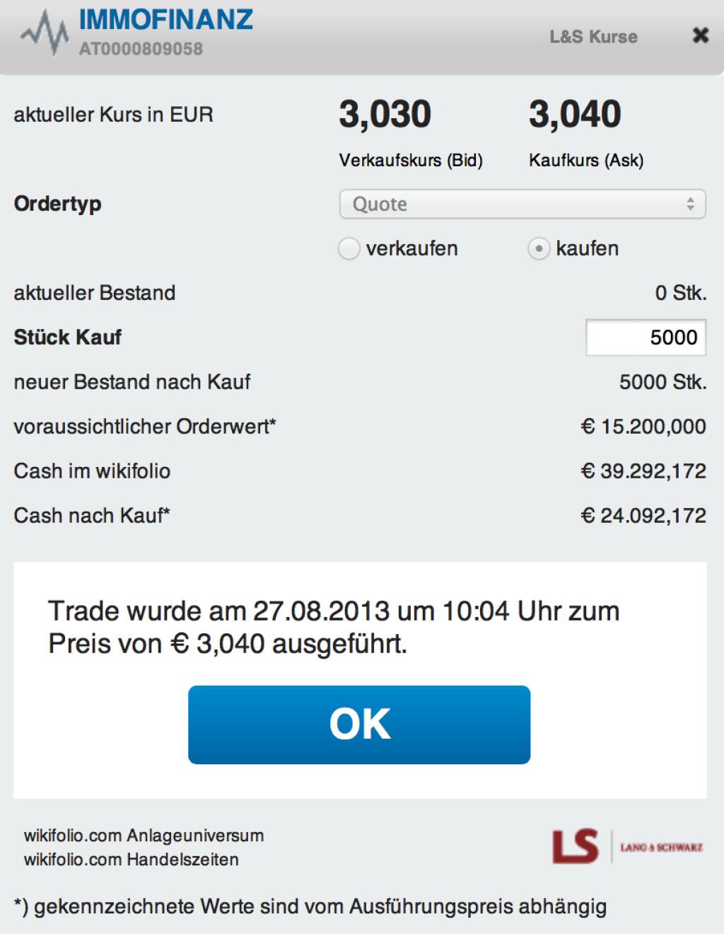10. Trade für https://www.wikifolio.com/de/DRASTIL1-Stockpicking-sterreich: IMMOFINANZ (AT0000809058) - kaufe 5000 Immofinanz im Vorfeld der Dividende, war im Vorjahr eine der besten Strategien auf dem Wiener Markt, bezahlt werden 15 Cent Anfang Oktober ...