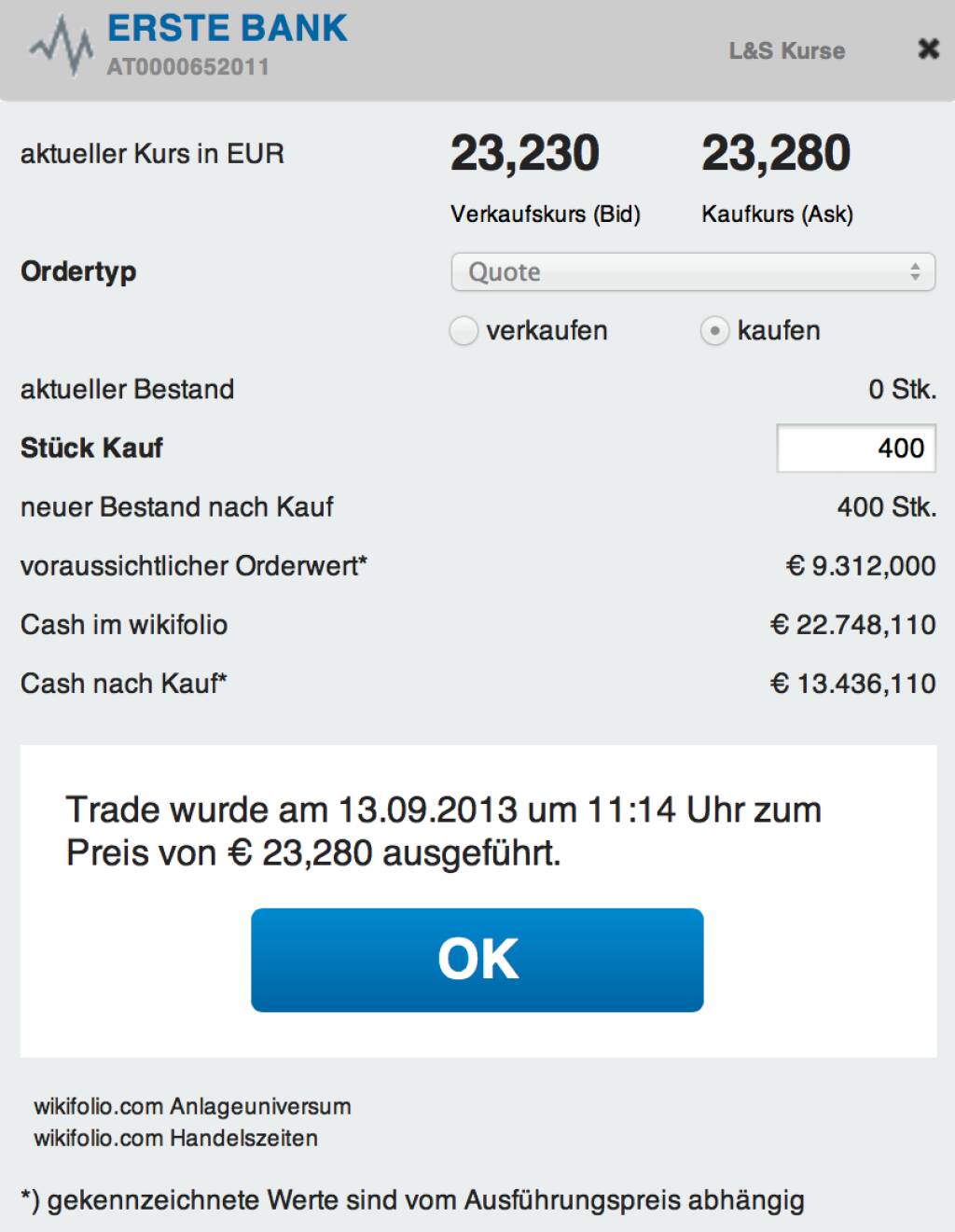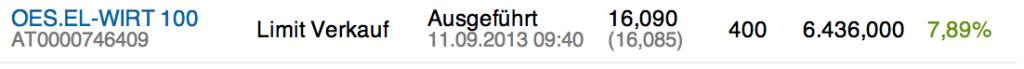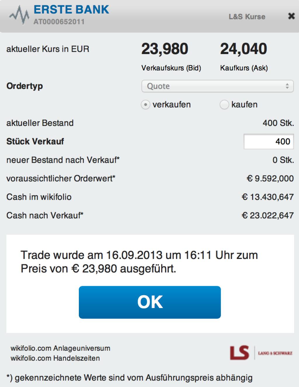 20. Trade für http://www.wikifolio.com/de/DRASTIL1: Erste Group (die bei L&S "Erste Bank" heisst). Ich verkaufe die 400 Stück, die ich erst am Freitag zu 23,28 ins wikifolio genommen habe, bei 23,98. Sind 3,01 Prozent Plus über das Weekend. Und vor allem: Die RBI liegt heute nach einer Gewinnwarnung schwer im Minus, das kann schon auf das Sentiment drücken.