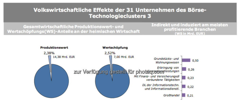 - durch das für die Studie herangezogene börsenotierte Unternehmenssample wird eine gesamtwirtschaftliche Wertschöpfung von insgesamt 29,85 Mrd. Euro initiiert. Mehr als jeder zehnte Euro der heimischen Wertschöpfung ist gesamtwirtschaftlich auf die börsenotierten Unter- ehmen zurückzuführen.