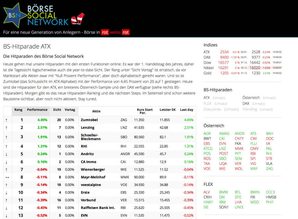 Und http://www.boerse-social.com am 2.1.2014? Heute gehen mal unsere Hitparaden mit den ersten Funktionen online. Es war der 1. Handelstag des Jahres, daher ist die Tagessicht logischerweise auch die year-to-date-Sicht. Der Rang unter "Sicht Vortag" ist erratisch, da vor Marktstart alle Aktien zwar mit "Null Prozent Performance", aber doch alphabetisch gereiht waren. Und so ist Zumtobel (das Schlusslicht im ATX-Alphabet) mit der Performance von 4,45 Prozent von 20 auf 1 gestiegen. Heute sind die Hitparaden für den ATX, ein breiteres Österreich-Sample und den DAX verfügbar (siehe rechts BS-Hitparaden). Morgen gibt es das neue Hitparaden-Ranking und die nächsten Steps. Im Seitenteil sind schon weitere Bausteine sichtbar, aber noch nicht aktiviert. Stay tuned. (02.01.2014)