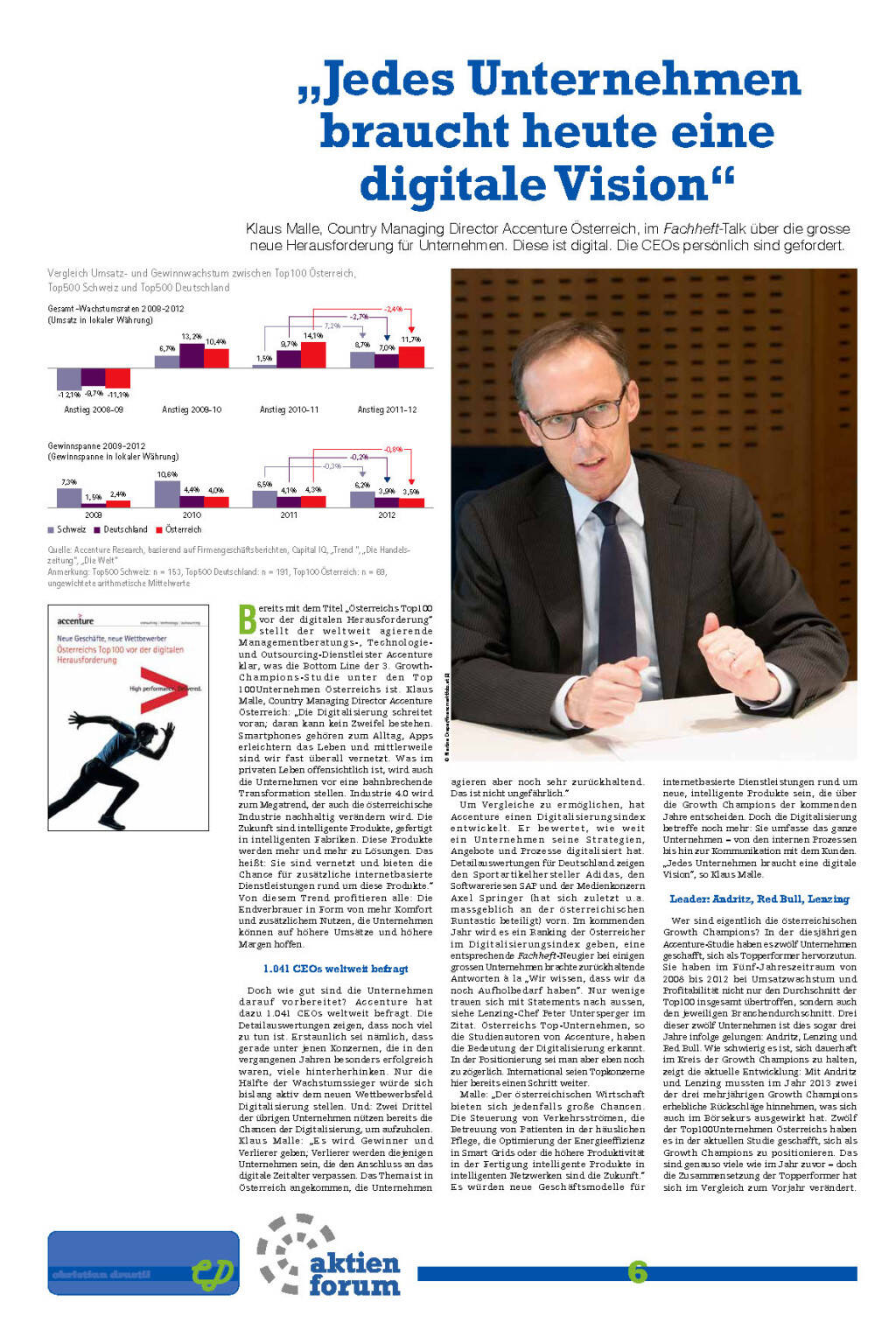 Unabhängig von der Digitalisierungsaufgabe attestiert Accenture den Growth Champions, dass sie perfekt über das Marktgeschehen informiert sind, über die finanzielle Feuerkraft verfügen, um in notwendige Anpassungen sofort investieren zu können bzw. dass sie eine ebenso an strategischen Zielen wie an Werten ausgerichtete Unternehmensführung leben. Im Drei-Länder-Vergleich Österreich-Deutschland-Schweiz sieht man, dass österreichische Top-Unternehmen ungebrochen profitabel wachsen. Im Vergleich mit Deutschland und der Schweiz würden sie jedoch gegenüber der Top100-Studie 2013 verlieren, obwohl die Österreicher beim Umsatzwachstum vorne bleiben. Mit einem Plus von 11,7 Prozent sind sie deutlich schneller gewachsen als die deutschen Top500Konzerne, die ihre Umsätze im gleichen Zeitraum nur um 7,0 Prozent steigerten. Auch die Schweizer Top500 konnten mit einem Plus von 8,7 Prozent nicht mit den Zuwächsen der österreichischen Konzerne mithalten. Doch die Wachstumsdynamik der österreichischen Großkonzerne hat sich verlang samt. Den Spitzenwert von 14,1 Prozent Umsatzwachstum aus der vorjährigen Studie konnten sie nicht wieder erreichen. Klarer Gewinner in puncto Wachstumsdynamik ist hier die Schweiz: Den Top500 ist es gelungen, ihr Umsatzwachstum innerhalb eines Jahres vornehmlich durch Akquisitionen im Ausland um 7,2 Prozentpunkte zu steigern, während der Trend sowohl in Österreich als auch in Deutschland rückläufig war. Und: Im Vergleich der Gewinnmargen ist Österreich gegenüber der Studie 2013 vom zweiten auf den dritten Platz zurückgefallen. Gesunken sind die Gewinnmargen in allen drei Ländern. Das Plus der österreichischen Top100 ist jedoch mit 0,8 Prozentpunkten am stärksten abgesackt – auf plus 3,5 Prozent.