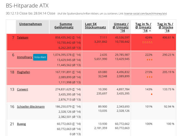 Der Blick auf internationale Trendwerte, sei es nach Handelsvolumen, Kursperformance oder Hitlisten-Veränderungen. Fokus auf DAX, Dow und die Börse Social Network Trending Aktien, jene 100 Aktien, die in unserer Datenbank als meistgehandelte bzw. -diskutierte Werte aufscheinen. Die BSNgine gewichtet dabei Broker, wikifolio, Kommentare und anderes.