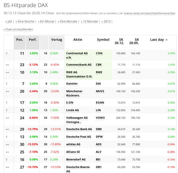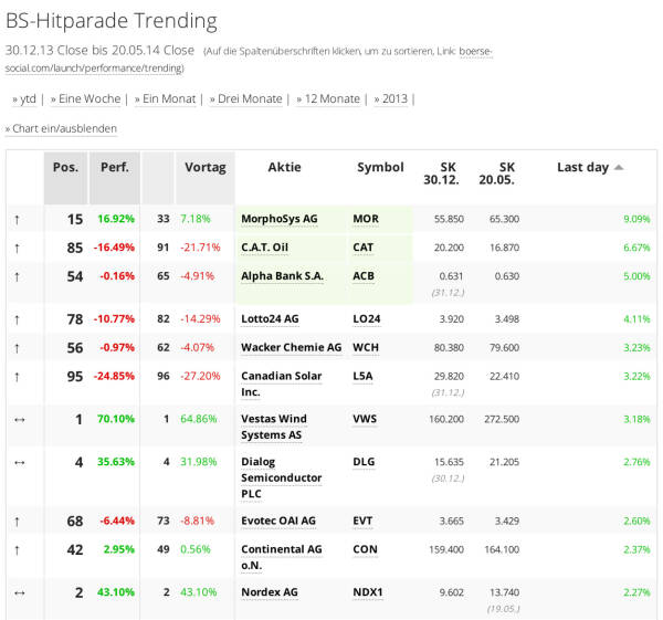 Der Blick auf internationale Trendwerte, sei es nach Handelsvolumen, Kursperformance oder Hitlisten-Veränderungen. Fokus auf DAX, Dow und die Börse Social Network Trending Aktien, jene 100 Aktien, die in unserer Datenbank als meistgehandelte bzw. -diskutierte Werte aufscheinen. Die BSNgine gewichtet dabei Broker, wikifolio, Kommentare und anderes.