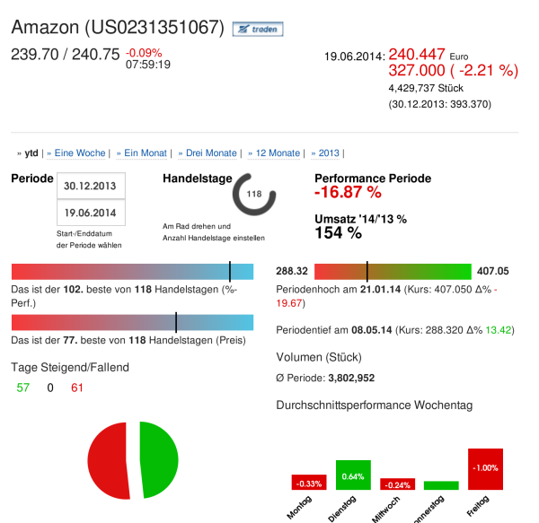 Amazon: 118 Handelstage, Performance Periode: -16.87 %, Umsatz '14/'13: 154 %