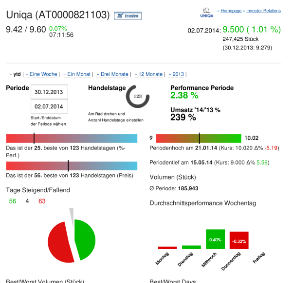 Uniqa: Letzter Schlusskurs (Euro): 9.500, das ist der 25. beste von 123 Handelstagen (%-Perf.) , das ist der 56. beste von 123 Handelstagen (Preis) , Periodenhoch am 21.01.14 (Kurs: 10.020 Δ% -5.19), Periodentief am 15.05.14 (Kurs: 9.000 Δ% 5.56), 123 Handelstage, davon ↑ 56 → 4 ↓ 63 , Performance Periode: 2.38 %, Umsatz '14/'13: 239 %
