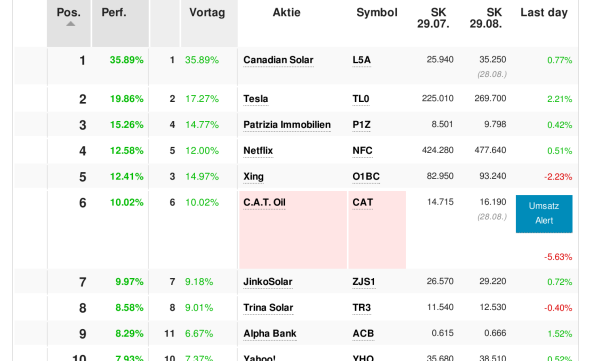 Canadian Solar, Tesla, Patrizia Immobilien, Netflix, Xing, C.A.T. Oil, JinkoSolar, Trina Solar, Alpha Bank, Yahoo!, waren im August top.