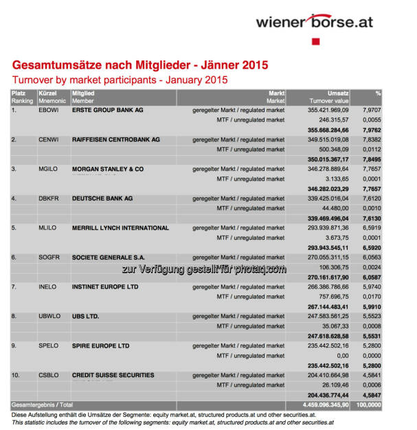 Die Umsatzstatistik für Jänner 2015 nach Handelsteilnehmern ist da. Vier Institute - Erste, RCB, Morgan Stanley und Deutsche Bank - liegen fast auf einer Höhe. Die Erste ist Leader, profitiert dabei vom Brokerjet-Effekt, der Broker wird seit September 2014 hinzugerechnet. Ohne Brokerjet wäre die Erste wohl auf Rang 4 oder 5.