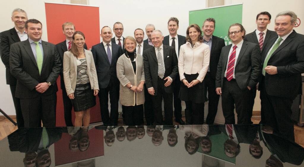 Bild vom Zertifikate-Jahresauftakt: Michael Bohnenstingl (Wiener Börse AG), Christoph Burgstaller (FMA), Georg Zinner (OeKB), Martina Beran (ZFA), Thomas Wulf (EUSIPA), Wilhelm Celeda (ZFA-Aufsichtsrat, RCB), Heike Arbter (ZFA-Vorstand, RCB), Frank Weingarts (ZFA-Vorstand, UniCredit), Christian Drastil (Börse Social Network), Harald Seisenbacher (OeKB), Markus Bunk (Bankwissenschaftliche Gesellschaft), Claudia Ivanov-Huber (Erste Group), Hubertus Hecht (OeKB), Markus Kaller (ZFA-Vorstand, Erst