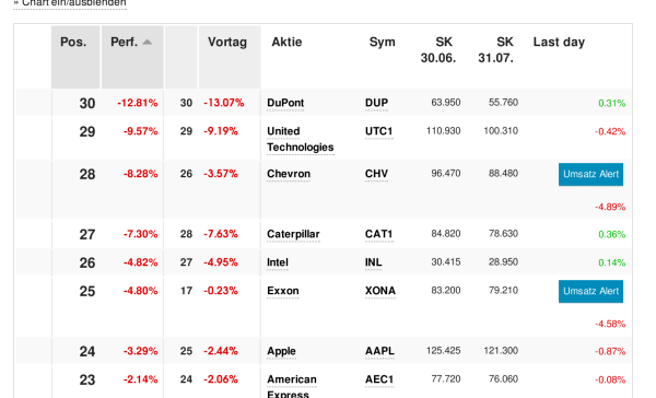 DuPont, United Technologies, Chevron, Caterpillar, Intel, Exxon, Apple, American Express, Procter & Gamble, 3M waren die schwächsten Dow-Werte im Juli.